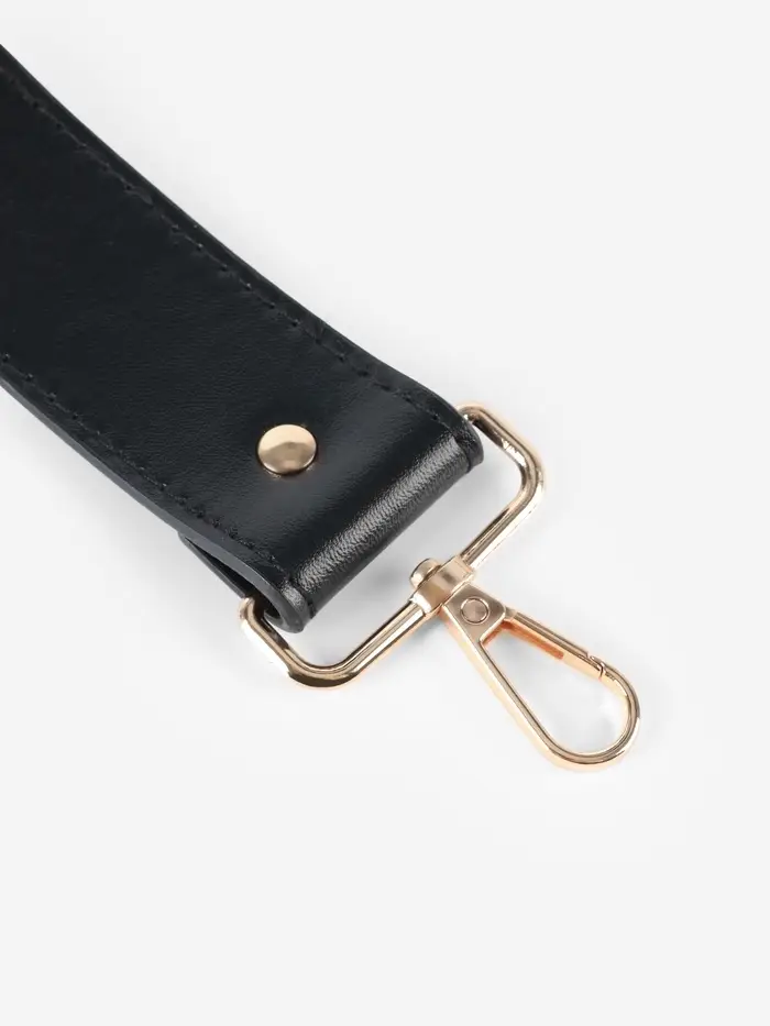 Эта черная ручка для сумки с карабинами — стильное и практичное решение для обновления вашего аксессуара. Ее длина 35±1 см делает ее удобной для ношения через плечо или в руке. Искусственная кожа высокого качества и золотая фурнитура создают элегантный и современный образ.