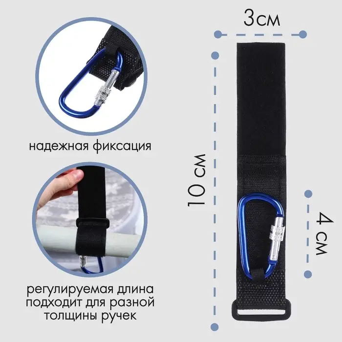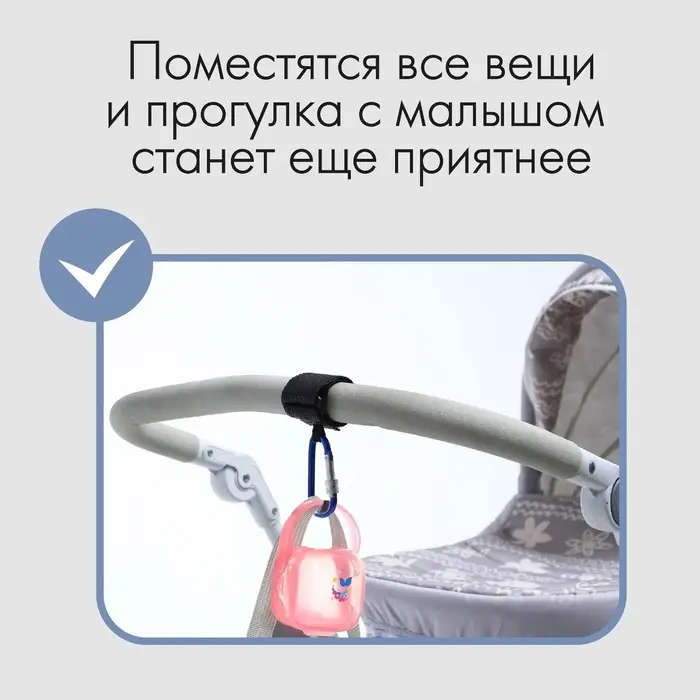 Универсальный карабин на липучке — маленький, но очень полезный аксессуар для мам. Его главное преимущество — простота крепления к разнообразным поверхностям: ручкам колясок, рулям велосипедов, мопедов и квадроциклов. С карабином легко организовать пространство вокруг себя: закрепить сумку на коляске во время прогулки, в машине он поможет разместить сумки и пакеты, если зафиксировать его на подголовнике. Практичность, надёжность и универсальность в одном небольшом приспособлении.