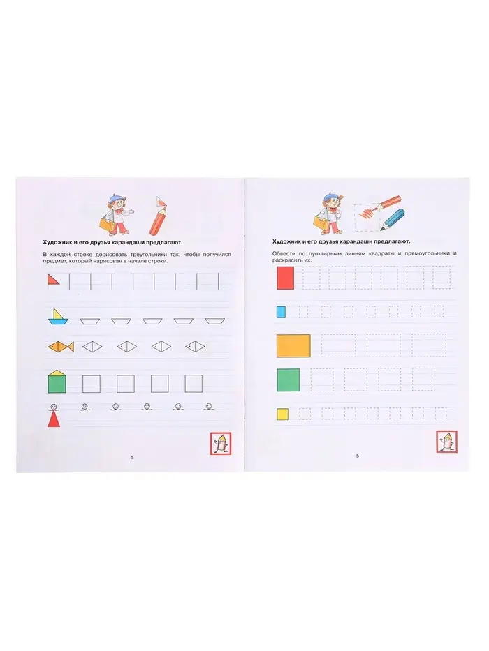 - Вместе со сказочными героями ребёнок научится обводить предметы по пунктирным линиям, писать буквы русского алфавита в клеточке, рисовать предметы в тетради в клеточку, линейку, познакомится с понятиями широкая строка и узкая строка и т. д.