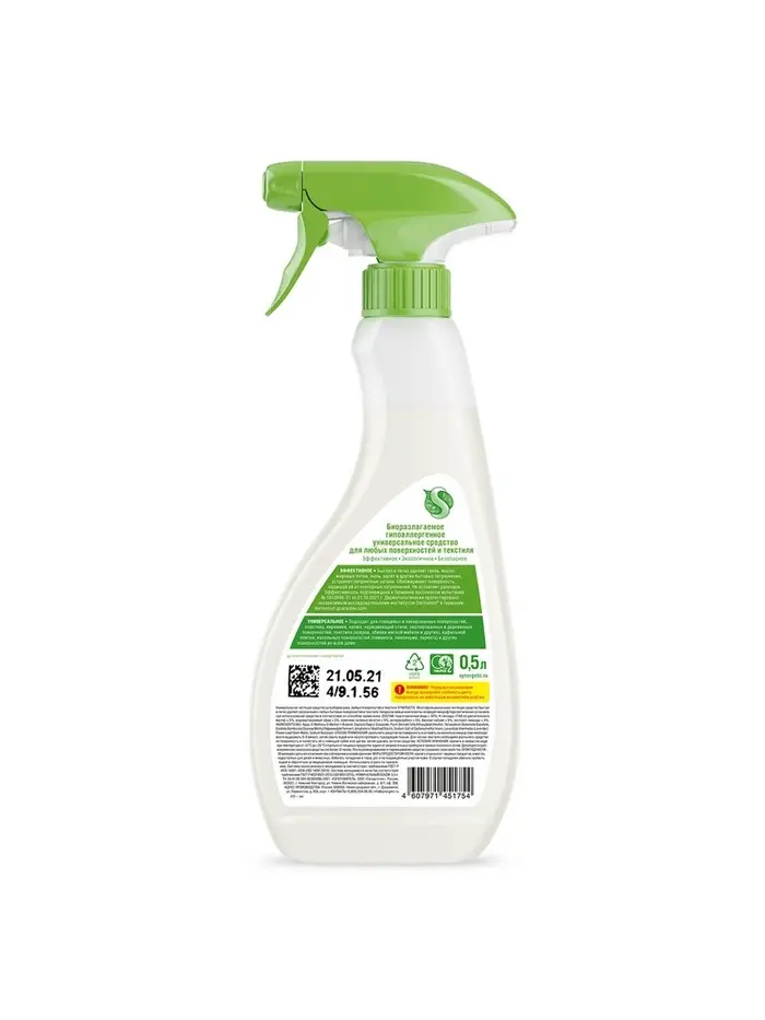 Средство чистящее для уборки дома, любых поверхностей и текстиля, гипоаллергенное, универсальное, 0.5 л