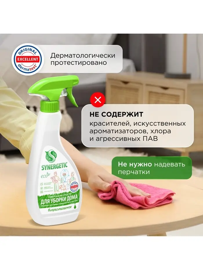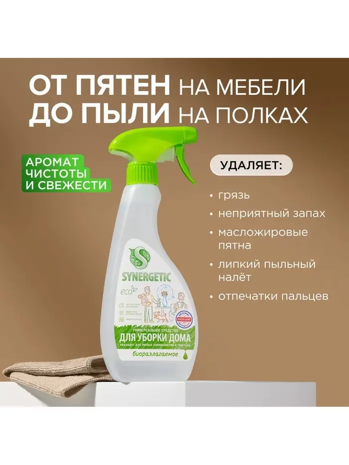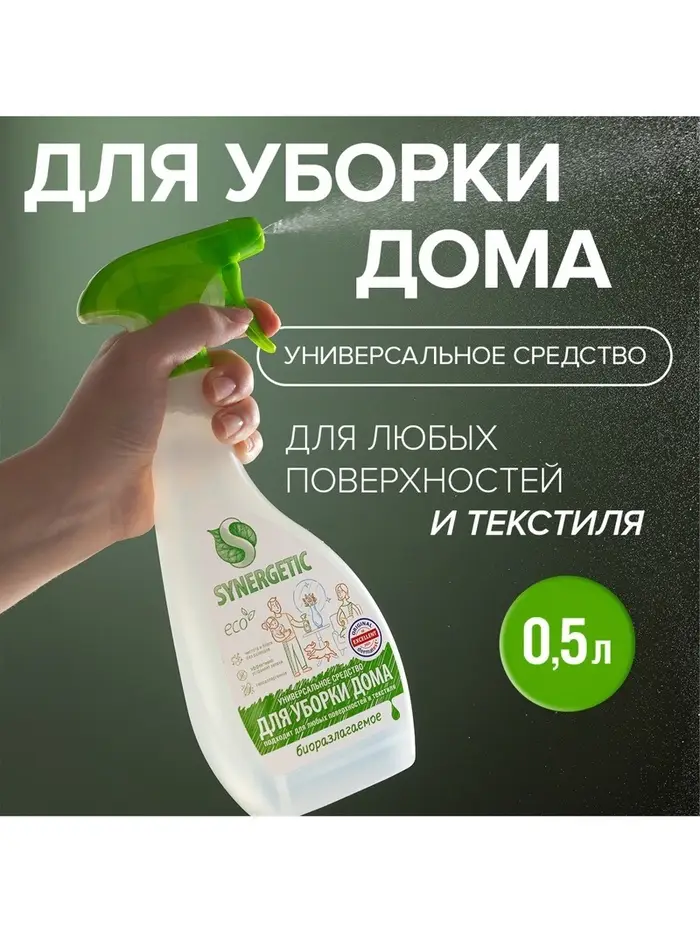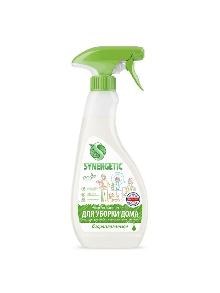 Универсальный биоразлагаемый спрей для уборки SYNERGETIC - это многофункциональное чистящее средство, которое быстро и легко удаляет любые виды бытовых загрязнений: грязь, масложировые пятна, пыль, налет. Эффективно устраняет неприятные запахи и обезжиривает поверхность, защищая ее от повторного загрязнения.