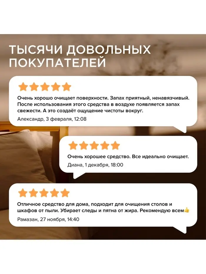 Спрей подходит для любых видов поверхностей: напольных (ламината, линолеума, паркета), глянцевых и лакированных, эмалированных и деревянных, пластика, керамики, хрома, нержавеющей стали, текстиля (ковров, обивки мягкой мебели и других), кафельной плитки. Легко смывается, не оставляя разводов, и придает блеск.