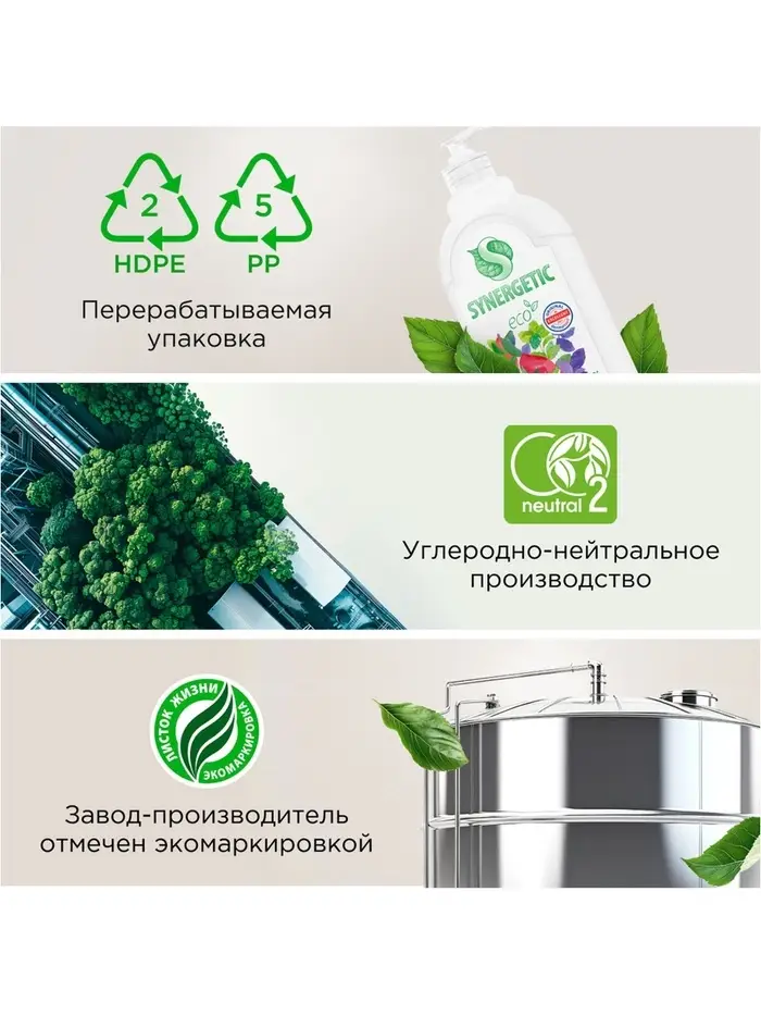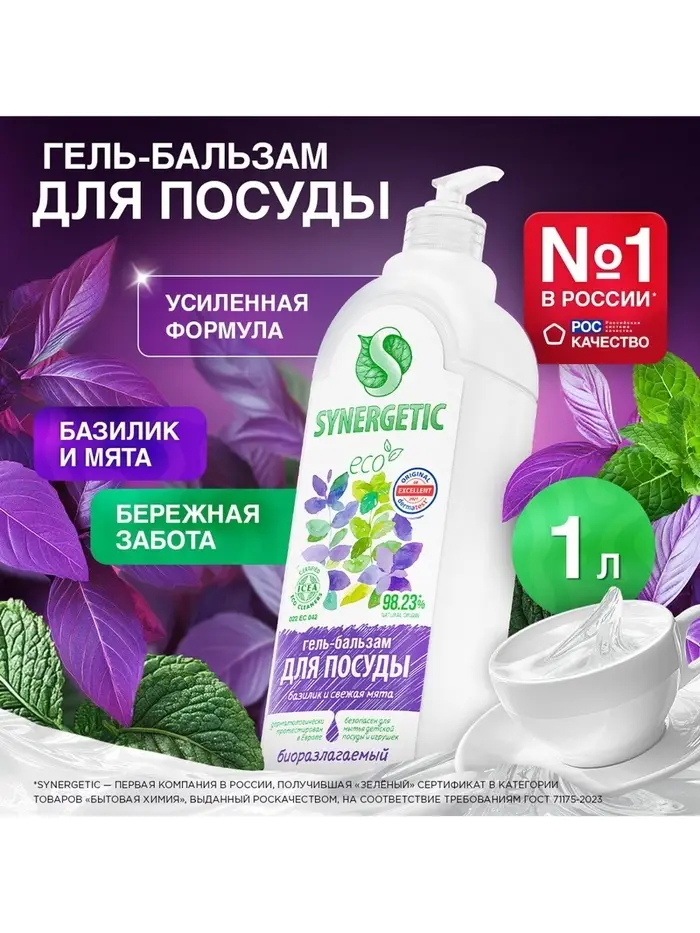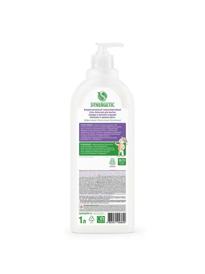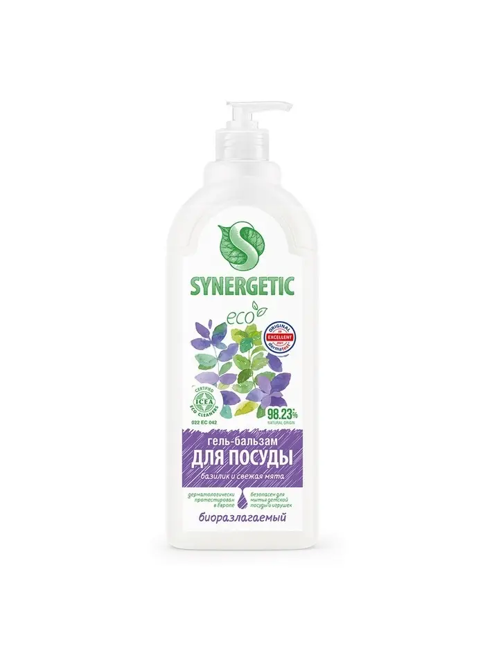 Биоразлагаемый гель-бальзам для мытья посуды и детских игрушек SYNERGETIC "Базилик и свежая мята" - это экологичное, безопасное и эффективное средство для мытья всех видов посуды, в том числе детской, кухонного инвентаря и детских игрушек от любых видов загрязнений.