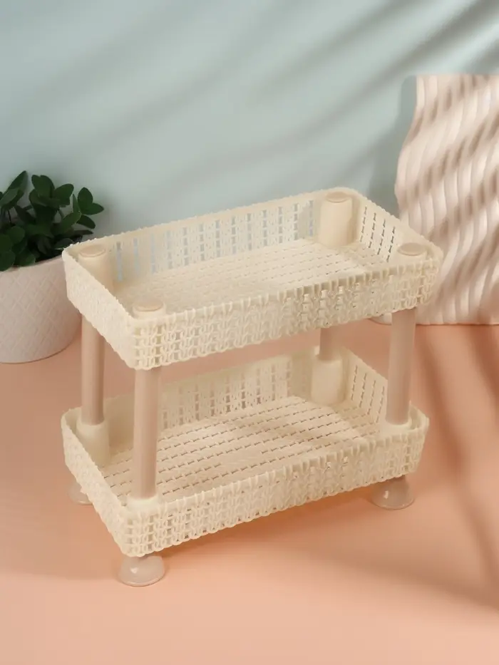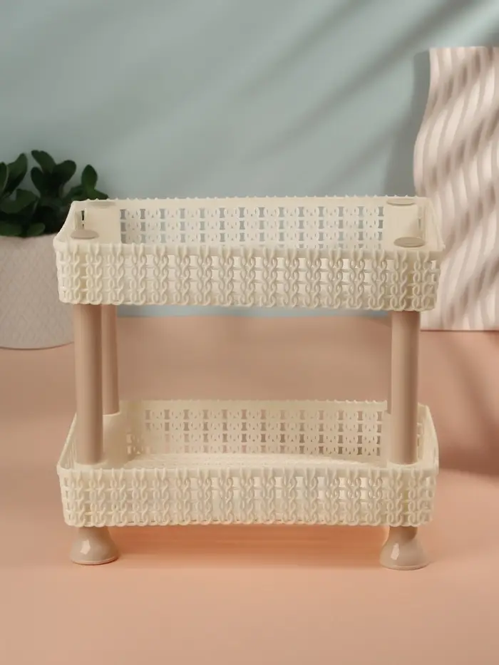 Органайзер изготовлен из прочного пластика, который не имеет неприятного запаха и устойчив к внешним воздействиям. Два уровня позволяют удобно распределять косметику, аксессуары и другие мелочи: нижний ярус идеален для крупных предметов, а верхний — для более мелких принадлежностей, таких как кисти, флаконы или тюбики.