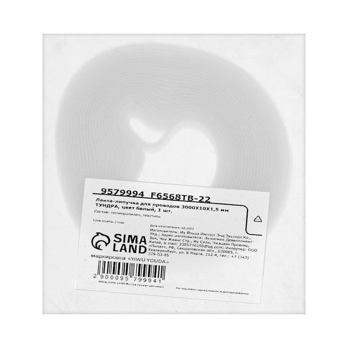 Лента-липучка для проводов 3000Х10Х1,5 мм ТУНДРА, цвет белый, 1 шт.