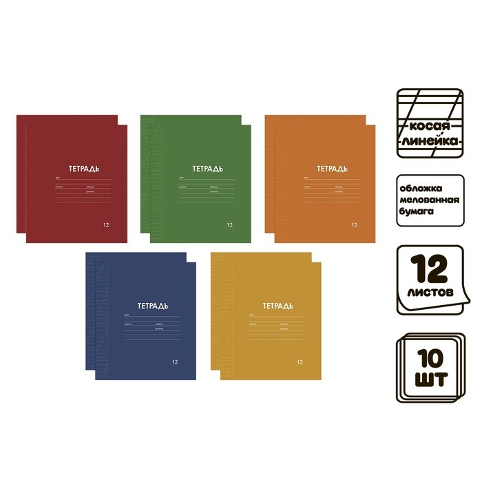 Комплект тетрадей из 10 штук, 12 листов в косую линию Calligrata "Однотонная Классика Линовка. Эконом", обложка мелованная бумага, ВД-лак, блок №2, белизна 75% (серые листы), 5 видов по 2 штуки
