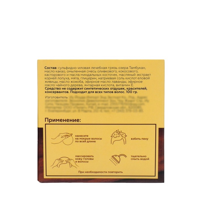 Состав: сульфидно-иловая лечебная грязь озера Тамбукан, масло какао, омыленная смесь оливкового, кокосового, касторового и масла миндальных косточек, масляный экстракт корней лопуха, мята, глицерин, натриевая соль кислот еловой живицы, масло жожоба, эфирное масло лаванды, эфирное масло чайного дерева, янтарная кислота, витамин Е.