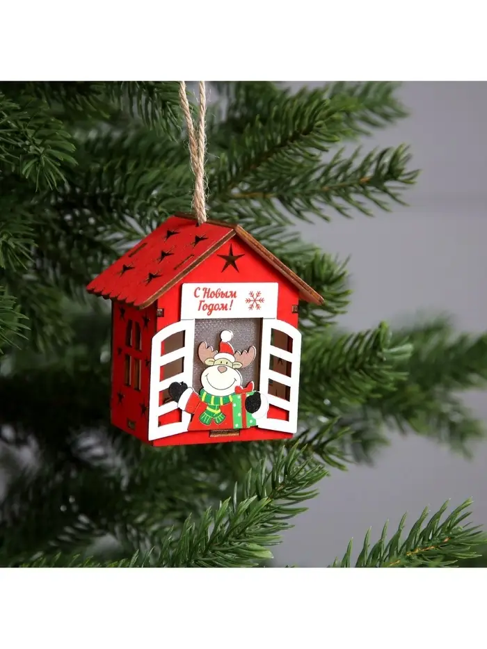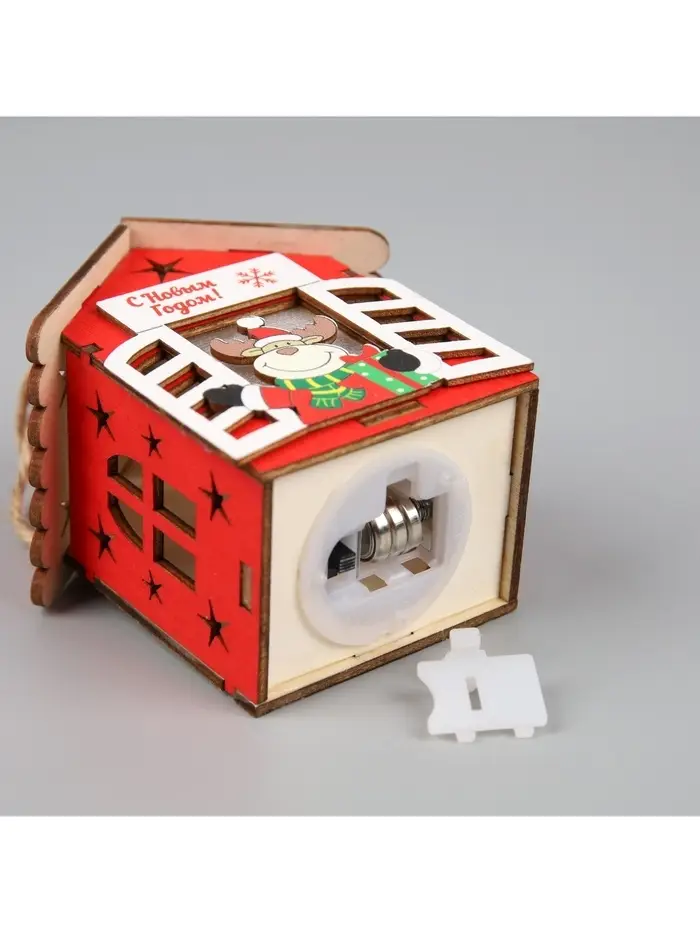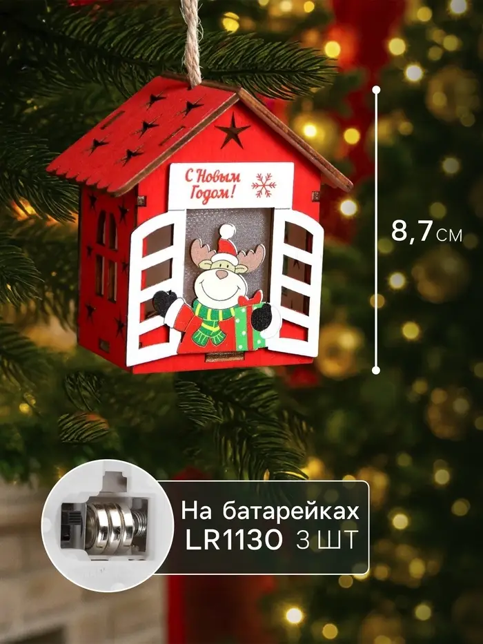 Изготовленный из дерева, домик с оленем освещает пространство тёплым белым сиянием, создавая уютную и праздничную атмосферу. Благодаря встроенному светодиоду, работающему от батареек, игрушка может быть размещена в любом месте, будь то ветки ёлки или полки в вашем доме. Его размеры 8.7x4.6 см делают его удобным для размещения и достаточно заметным.
