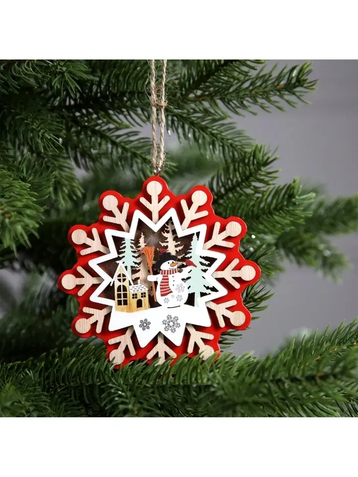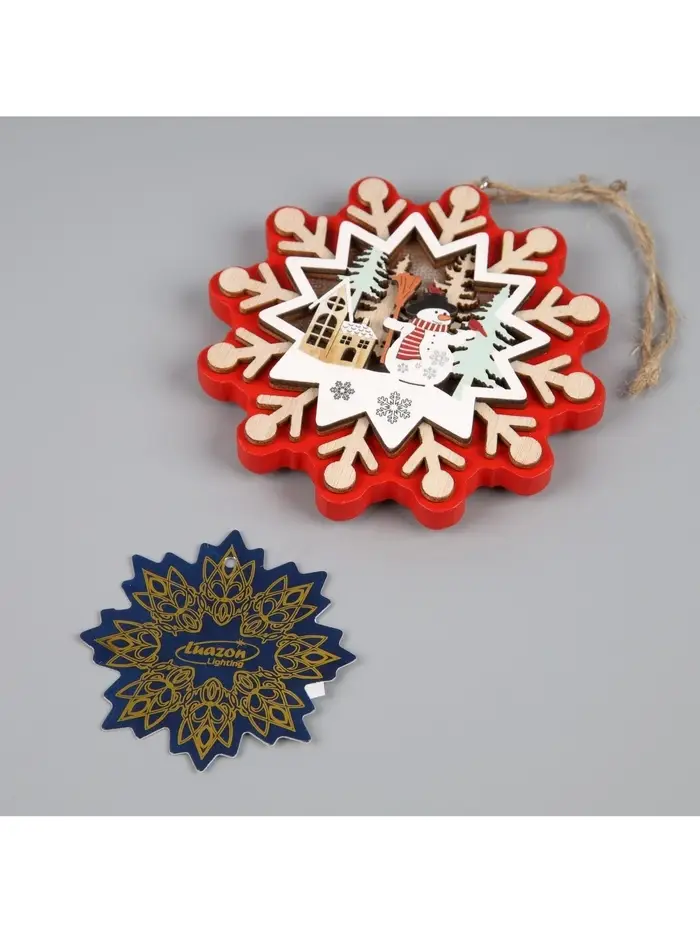 Изготовленная из дерева, снежинка со снеговиком освещает пространство тёплым белым сиянием, создавая уютную и праздничную атмосферу. Благодаря встроенному светодиоду, работающему от батареек, игрушка может быть размещена в любом месте, будь то ветки ёлки или полки в вашем доме. Её размеры 10x10 см делают её удобной для размещения и достаточно заметной.