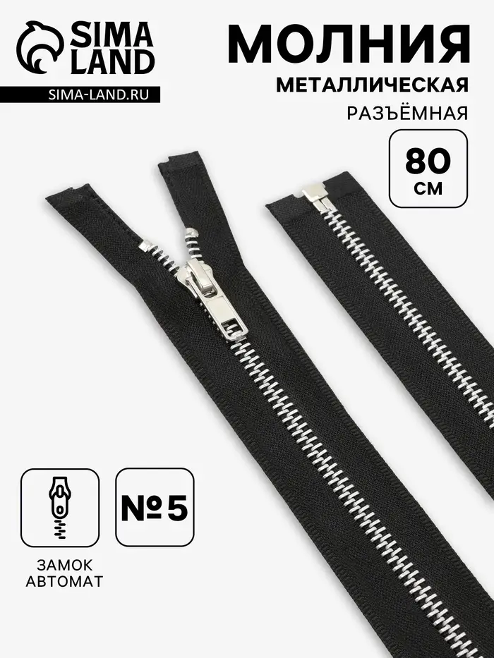 Молния металлическая, №5, разъёмная, замок автомат, 80 см, чёрная