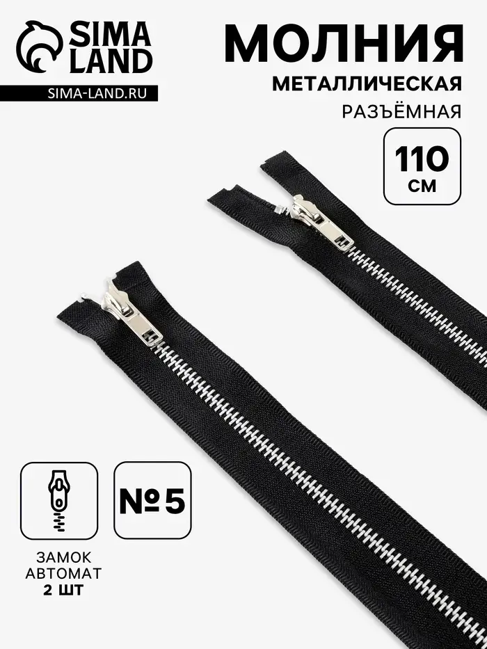 Молния металлическая, №5, 2 замка, разъёмная, замки автомат, 110 см, чёрная