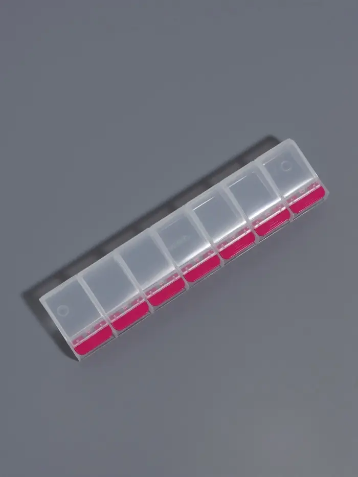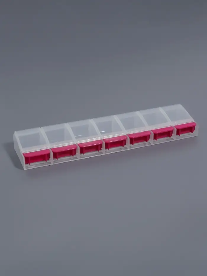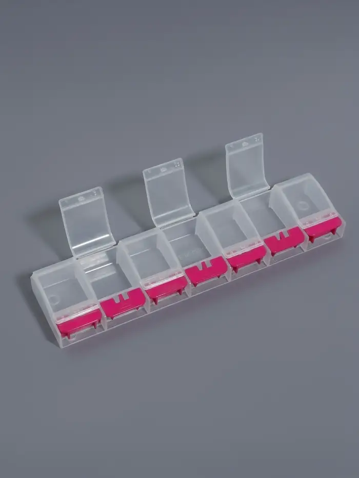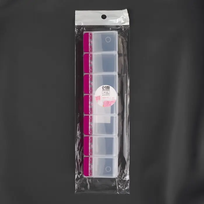 Прозрачный органайзер с розовыми кнопками с 7 секциями и удобными кнопками от «Арт Узор» (22×5×2,5 см) сочетает стильный дизайн с функциональностью. Его вытянутая форма идеальна для хранения на туалетном столике или рабочем месте.