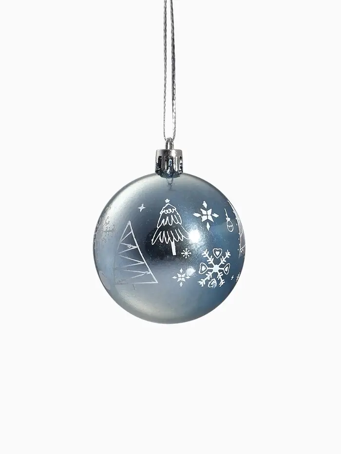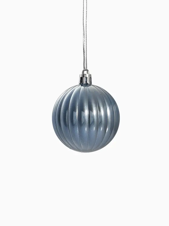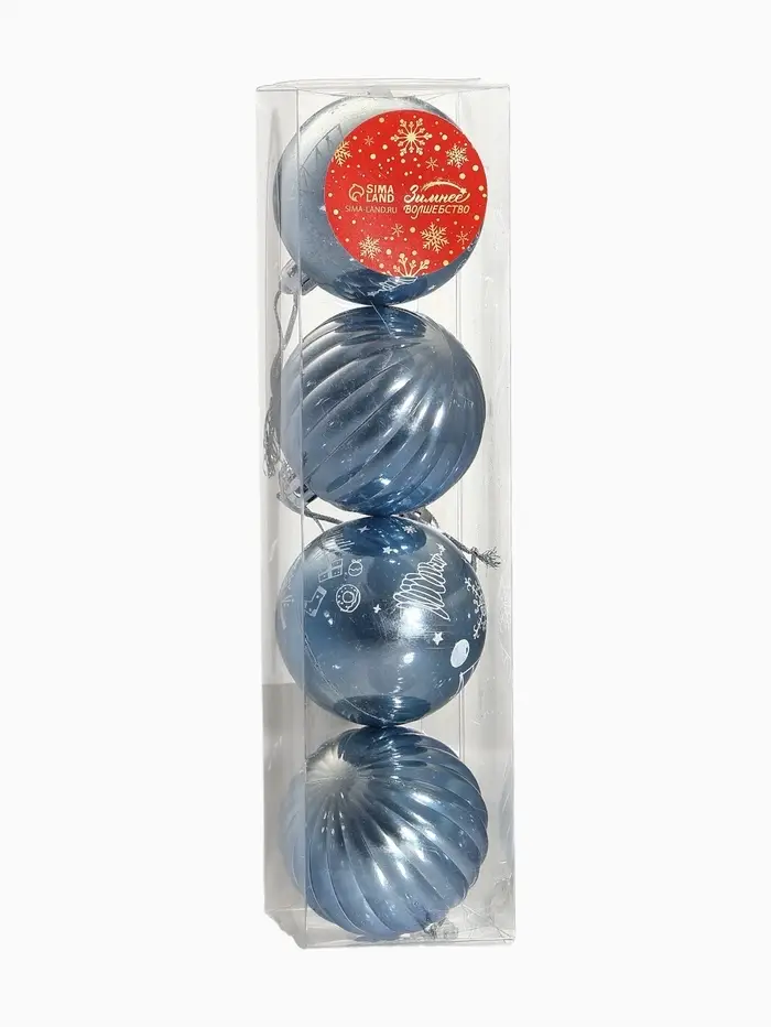 Набор из четырёх голубых шаров диаметром 5,5 см с полосатым рисунком выполнен в стиле шебби-шик. Эти пластиковые украшения добавляют нежности и винтажного шарма в новогодний декор, гармонично сочетаясь с другими праздничными элементами.