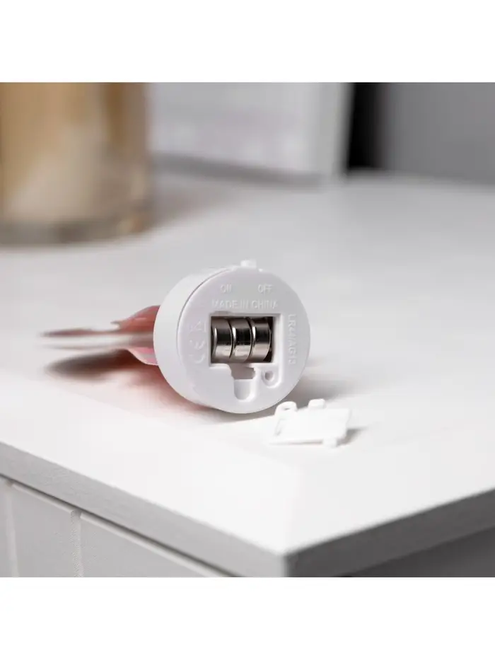 - Питание от батареек: три батарейки типа LR44 обеспечивают автономность и свободу расположения без проводов.