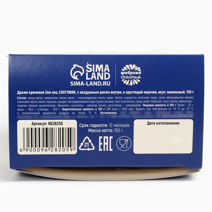 Состав: сахар-песок, заменитель масла какао – пальмоядровое масло, какао тёртое, сыворотка молочная сухая, сухое обезжиренное молоко, кокосовое масло, какао-порошок, продукт экструдированных круп (крупа рисовая, мука пшеничная, сахар, какао-порошок, соль), патока, эмульгатор – лецитин соевый, ароматизатор «Ванилин», краситель – диоксид титана, загуститель – гуммиарабик.