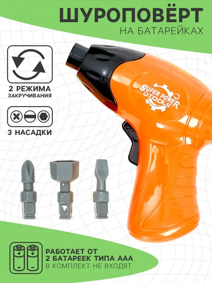 - Шуруповёрт работает от 2 батареек типа AAA (в комплект не входят).