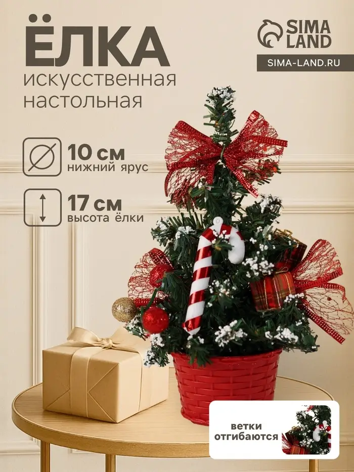 Настольная ёлка с отгибающимися ПВХ ветками высотой 17 см создаёт праздничное настроение в компактном формате. Яркие красные украшения — бантики, шары и леденцы — подчёркивают классический зелёный цвет хвои, добавляя интерьеру выразительности и тепла.