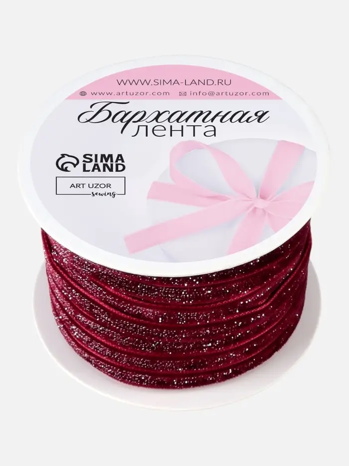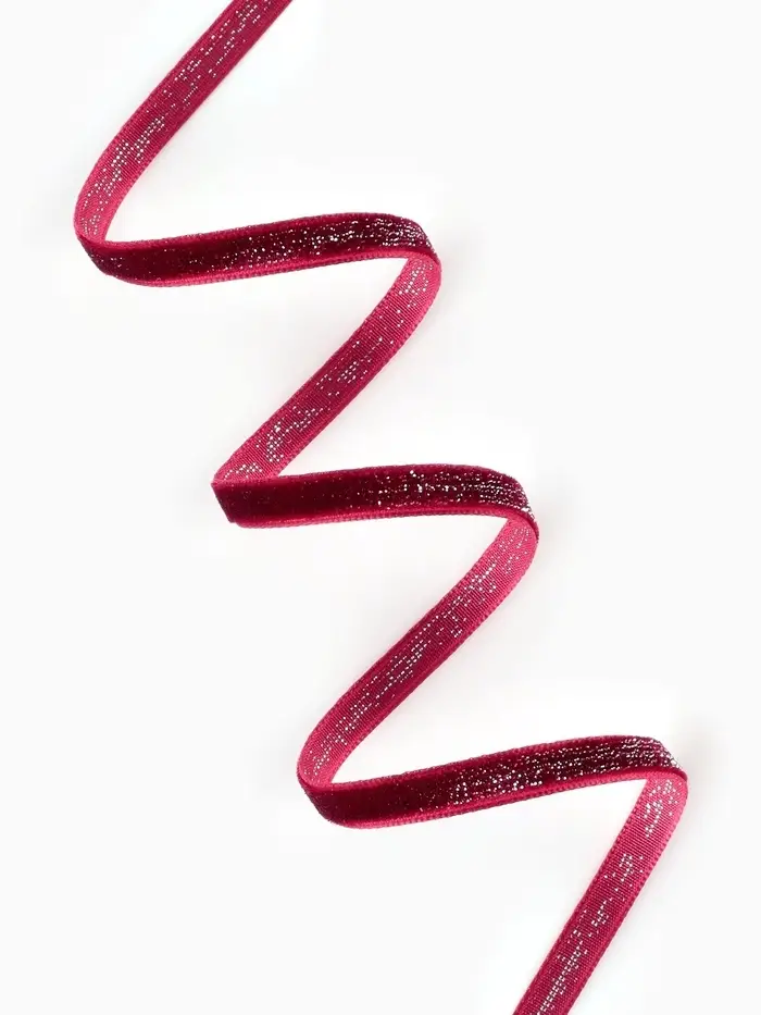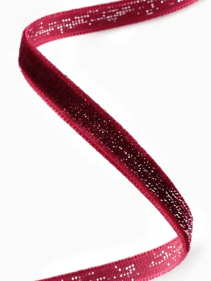 Эта узкая бархатная лента с серебряной нитью люрекса придаёт особое сияние любому проекту. Её глубокий винно-красный оттенок и мерцающий акцент создают ощущение роскоши и праздника, не требуя больших усилий. Вы получаете целую катушку, которой хватит на множество творческих идей.