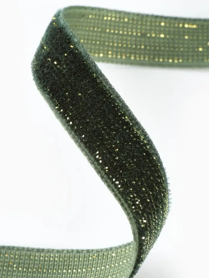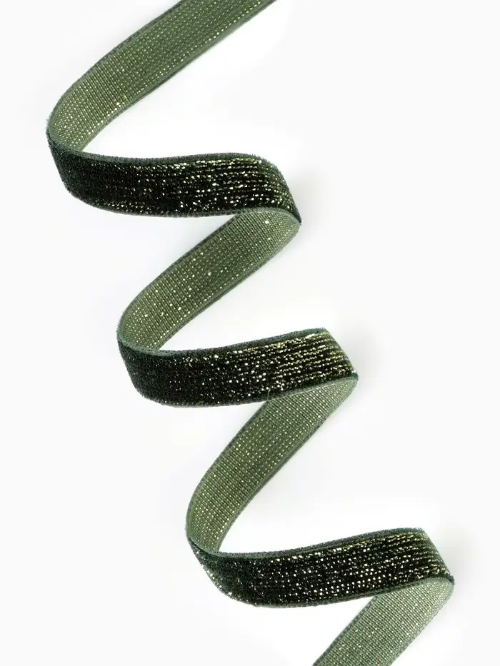 Эта бархатная лента с золотым люрексом придаёт творческим проектам природное сияние. Сочетание зелёного бархата и золотых нитей создаёт переливающийся эффект для выразительного декора.