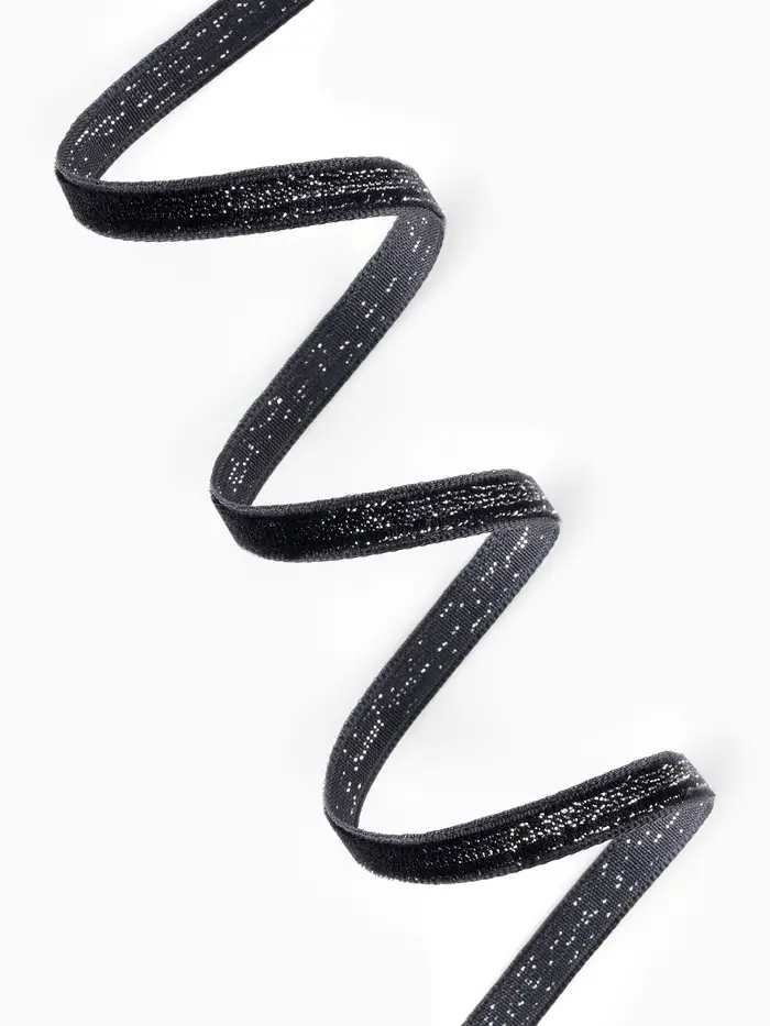 Узкая бархатная лента с серебряной нитью добавляет изысканный акцент в творческие проекты. Глубокий черный цвет с мерцающим люрексом создает элегантный контраст для декора и рукоделия.