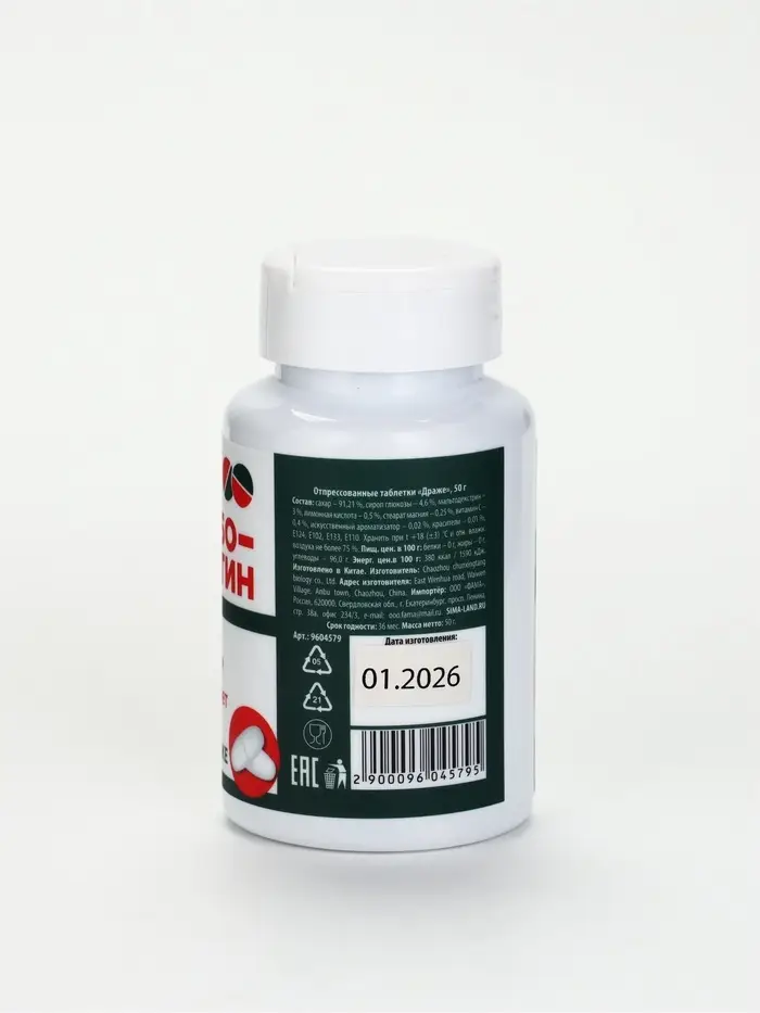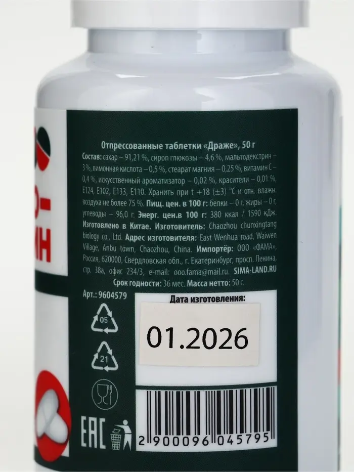 Состав: сахар 91,21 %, сироп глюкозы 4,6 %, мальтодекстрин 3 %, лимонная кислота 0,5 %, стеарат магния 0,25 %, витамин С 0,4 %, искусственный ароматизатор 0,02%, красители 0,01 %, Е129, Е102, Е133, Е110.