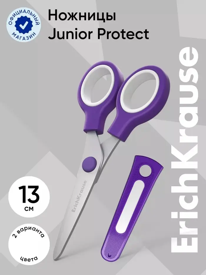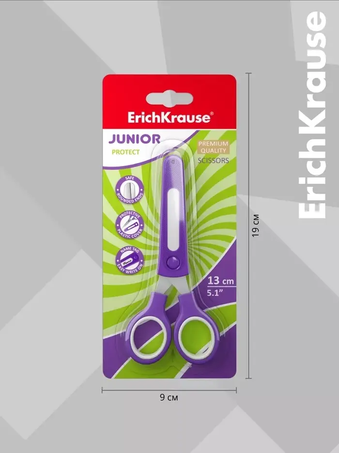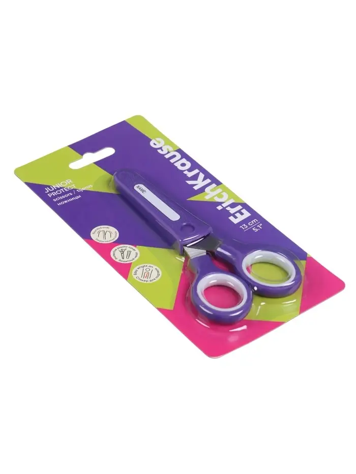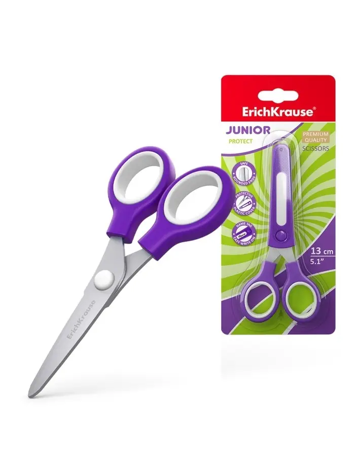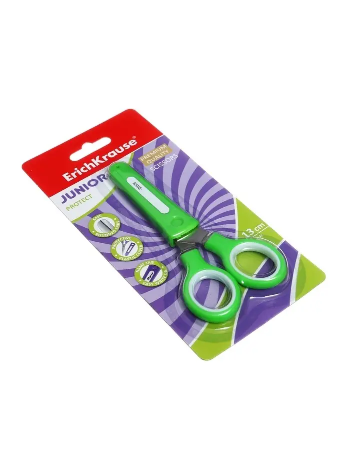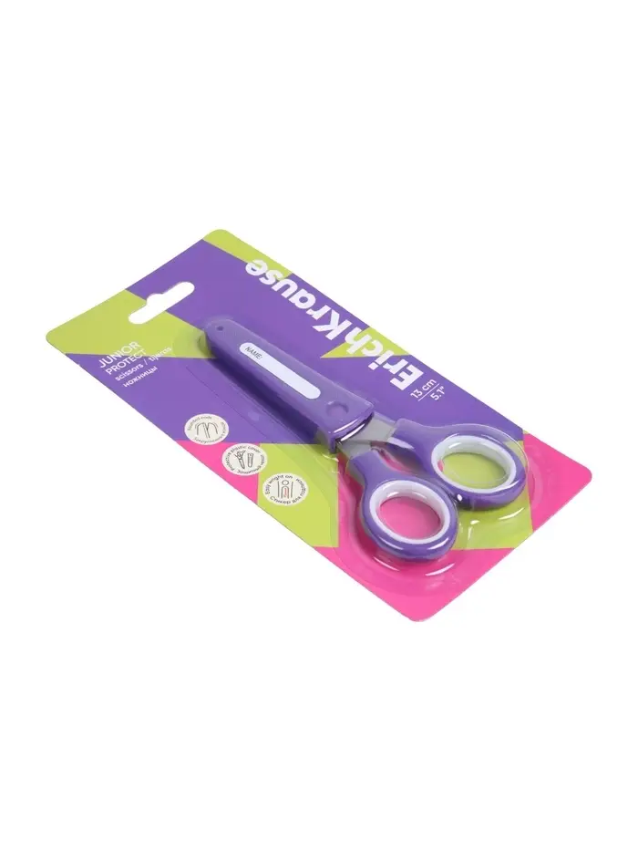 Ножницы детские ErichKrause Junior Protect, 13 см, с пластиковым чехлом и именным стикером, в блистере, МИКС