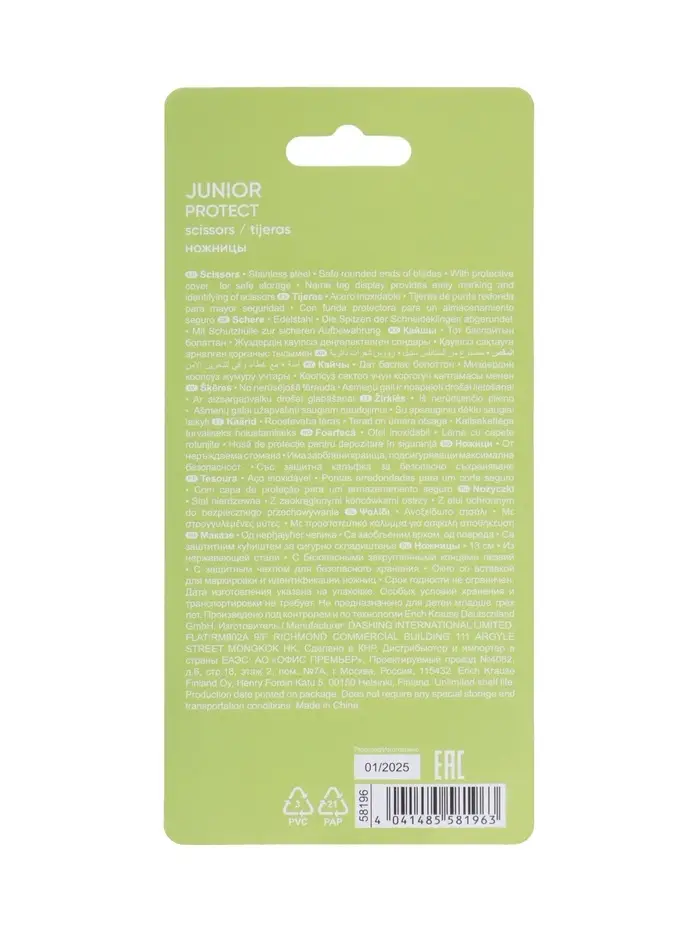 Ножницы из нержавеющей стали с безопасными закругленными концами лезвий. Наличие защитного чехла для безопасного хранения. Окно со вставкой для маркировки и идентификации ножниц