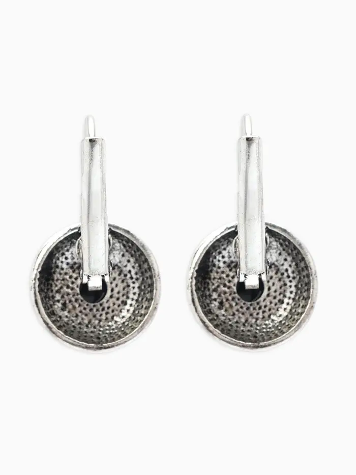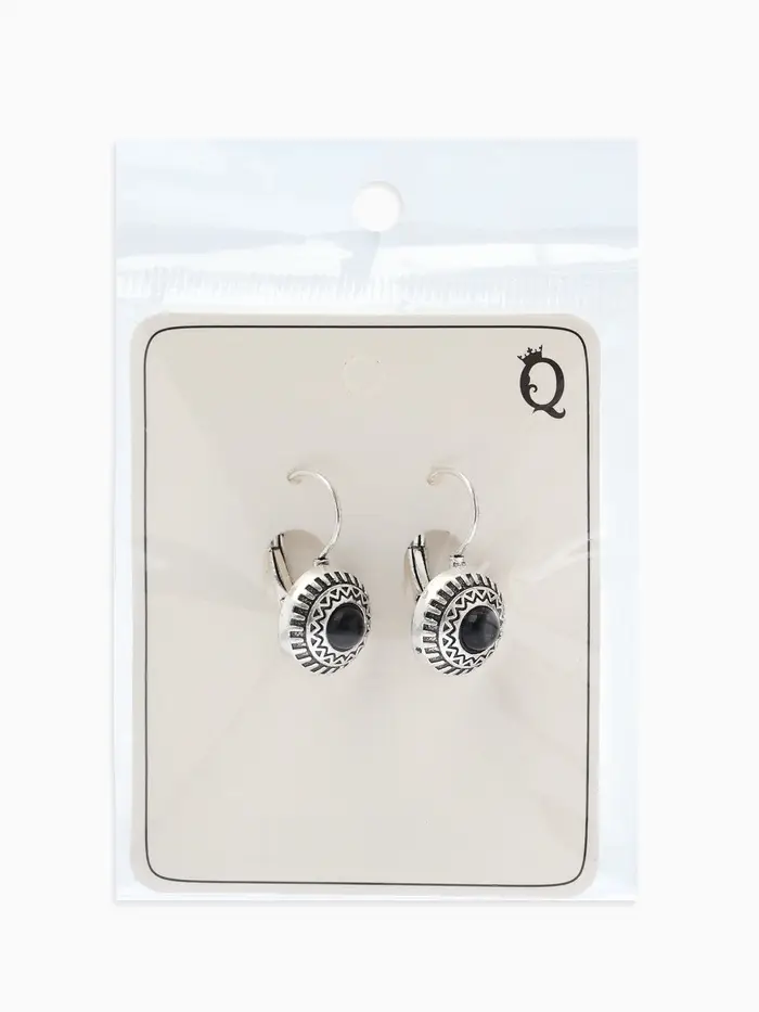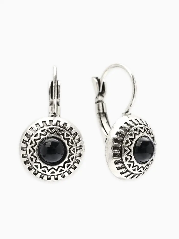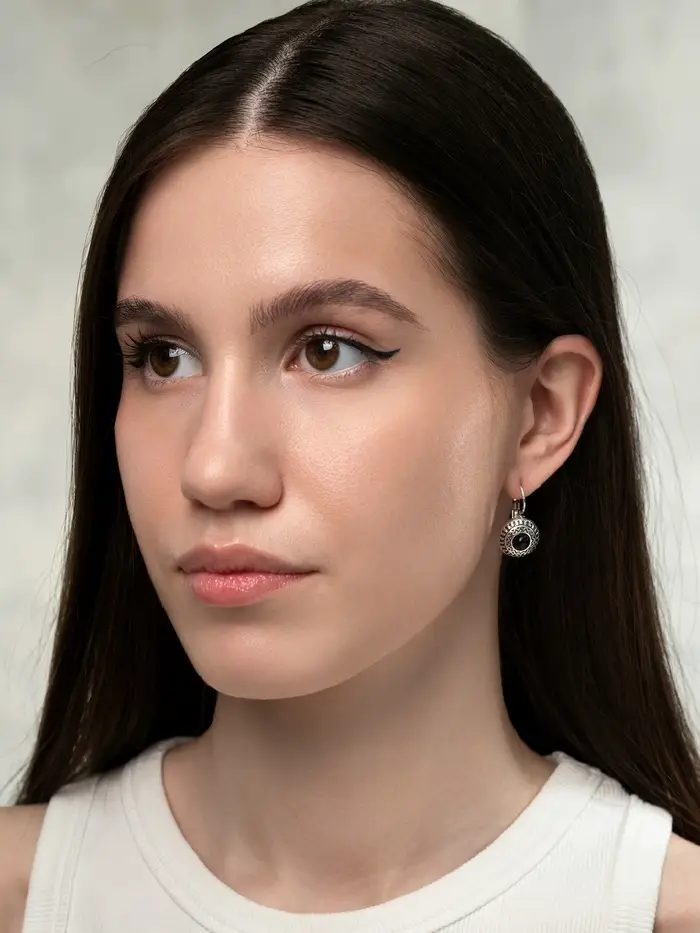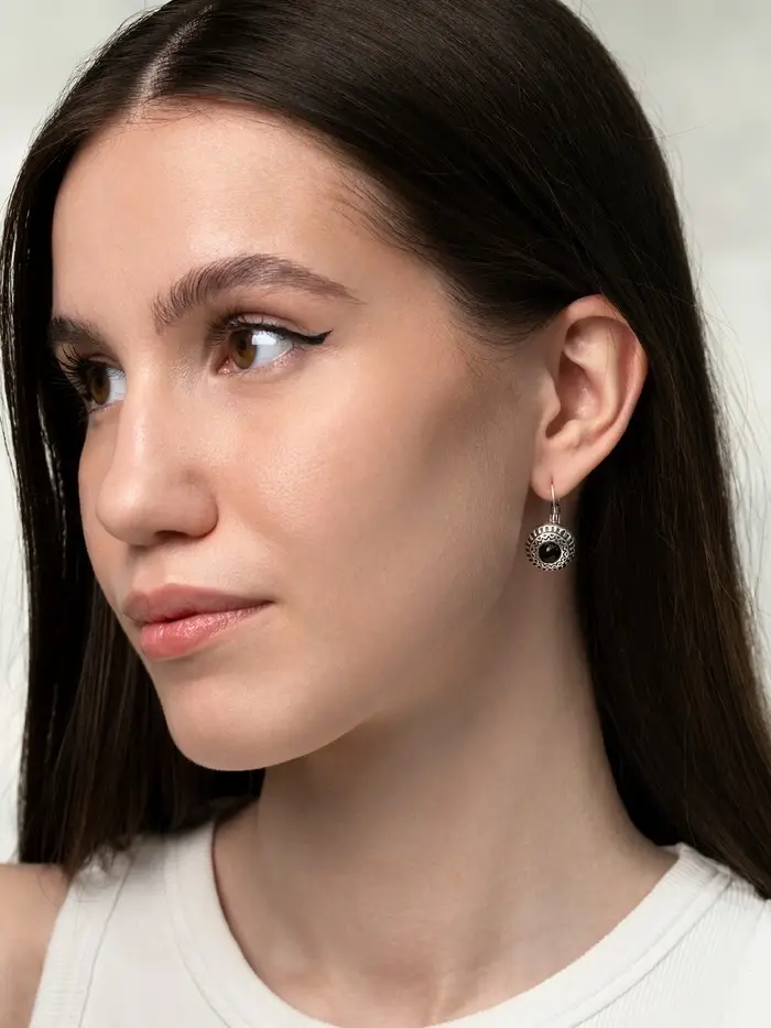 Серьги под натуральный камень «Этника», круг в узорах, чёрные в чернёном серебре