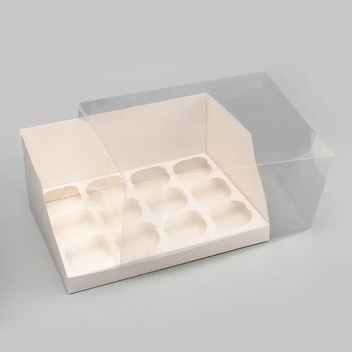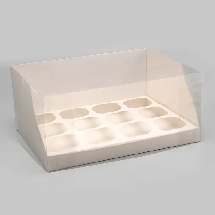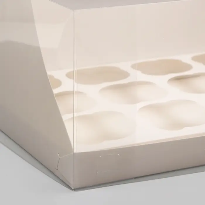 - Прозрачная крышка: Крышка коробки выполнена из прозрачного пластика, через который видно красочное украшение каждого капкейка. Получатель сразу оценивает красоту десерта, а сам крем защищен от пыли и случайных прикосновений.