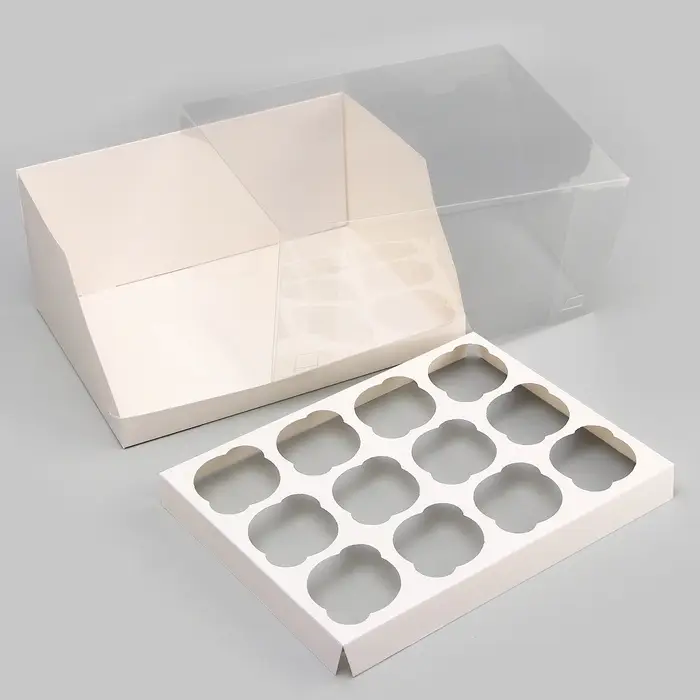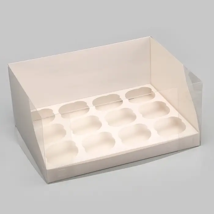 Для дюжины капкейков, которые хочется показать: Белая коробка для 12 капкейков 31×24×14 см решает главную задачу кондитера — безопасную доставку и эффектную презентацию. Высокая прозрачная крышка гарантирует, что кремовые шапочки не смажутся, а получатель сможет полюбоваться каждым капкейком еще до того, как откроет коробку. Коробка собирается быстро, что важно при больших объемах заказов. Белый цвет универсален и подходит для любых поводов — от детского дня рождения до свадьбы. Выбирайте эту коробку, когда нужно доставить 12 капкейков в целости и показать их во всей красе.