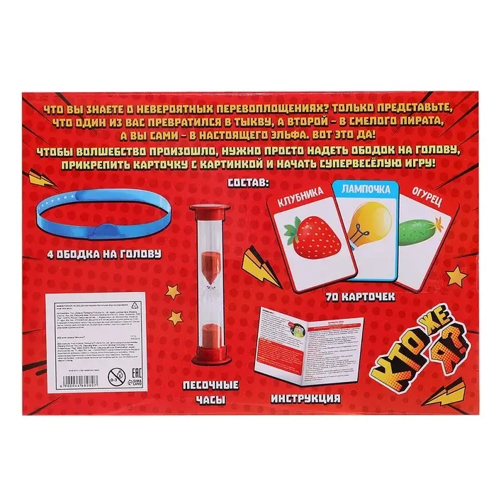 В ней представлены 70 карточек на разные тематики. Вы сможете превратиться в сказочную тыкву, хищное животное, отважного пирата или настоящего эльфа. Для этого вам необходимо надеть ободок на голову, закрепить карточку с картинкой и за 1 минуту догадаться, кто же вы!