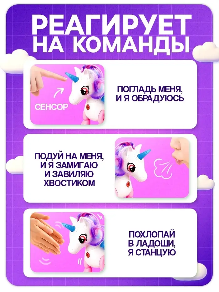 - Единорог оживает от ваших действий — он чувствует прикосновения, движения и звуки, отвечая радостными жестами, танцами и переливами света.