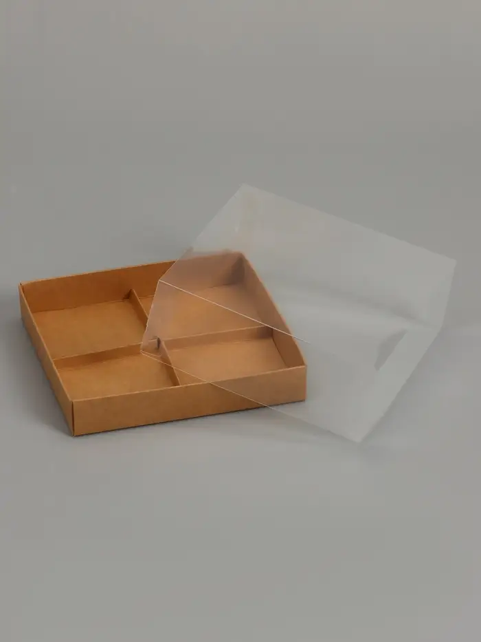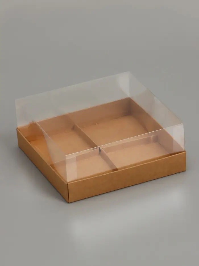- Квадратная крафт-коробка на четыре порции: Компактный формат (17х17 см) идеально подходит для размещения четырёх муссовых пирожных, макарун или эклеров. Квадратная форма обеспечивает устойчивость и аккуратную сервировку.