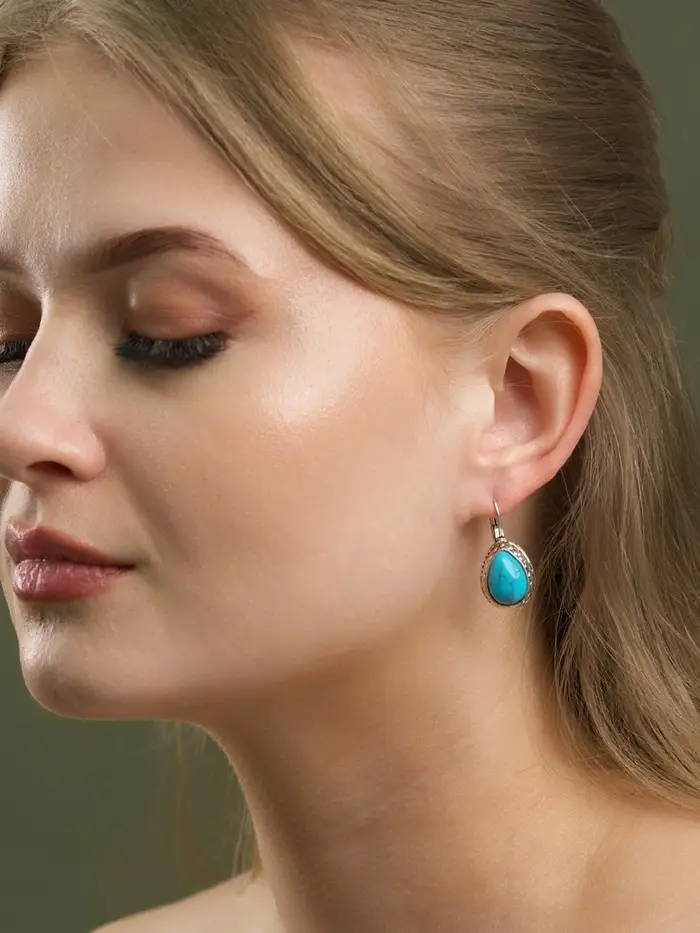 Замечательно завершить образ и придать ему этнический шарм помогут серьги с каплями бирюзы, выполненные в утончённом стиле этники. Каждая деталь этого украшения была продумана до мелочей, чтобы подчеркнуть вашу индивидуальность и вкус.