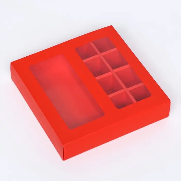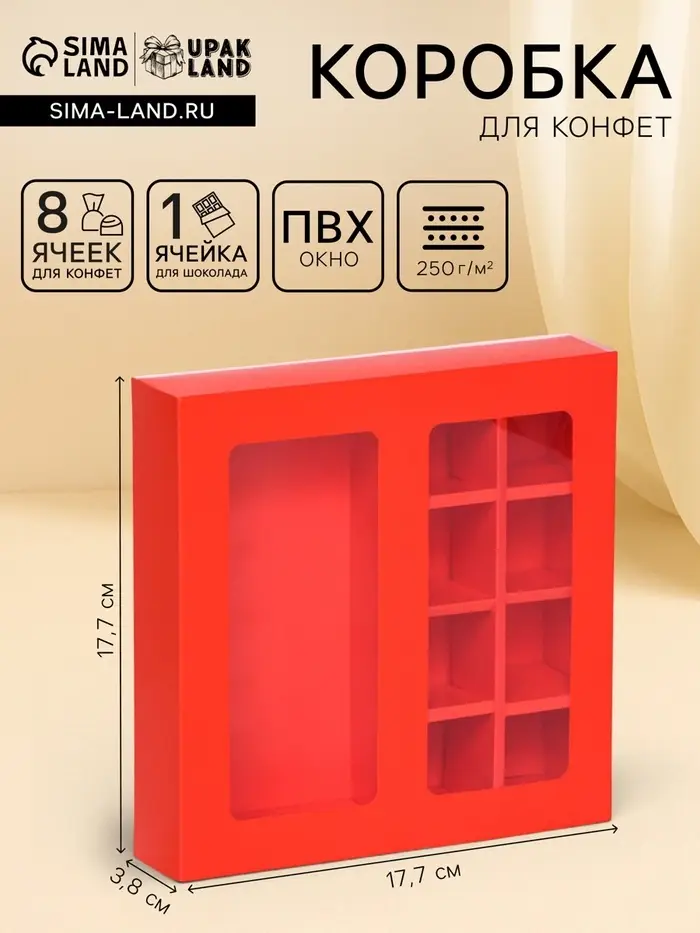 Коробка для 8 конфет + шоколад, с окном, алая, 17.7×17.7×3.8 см