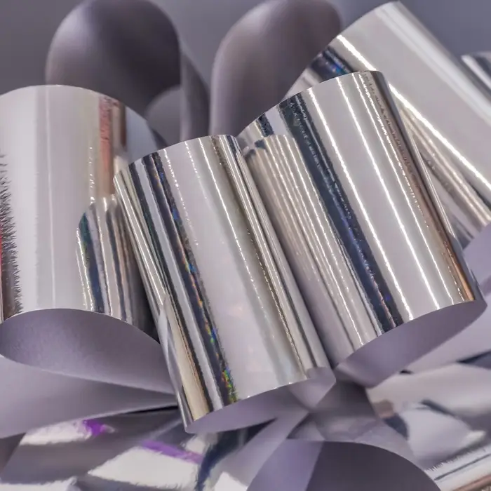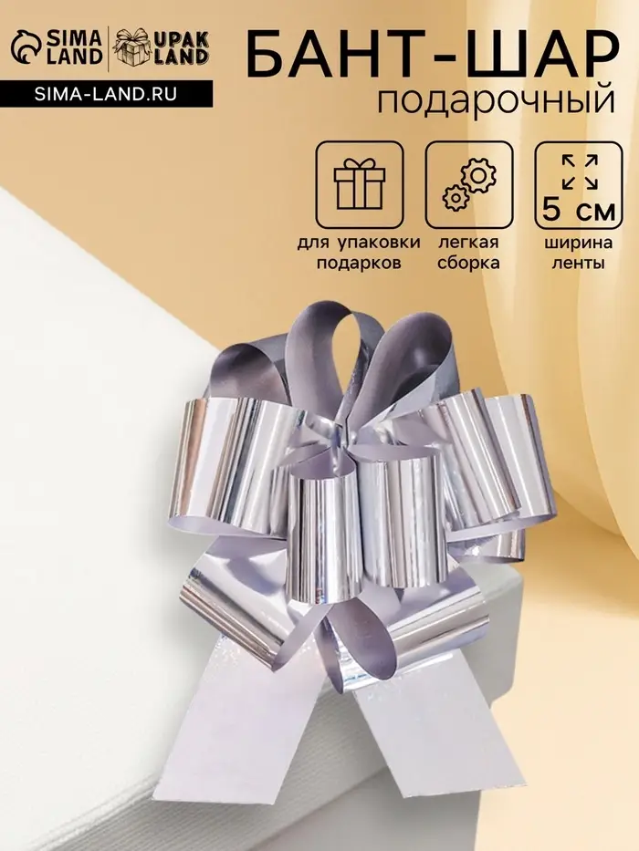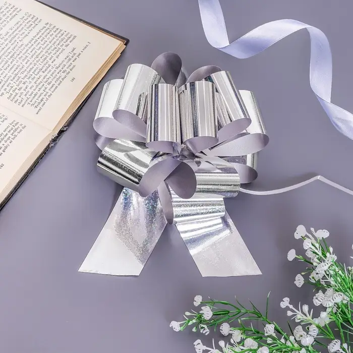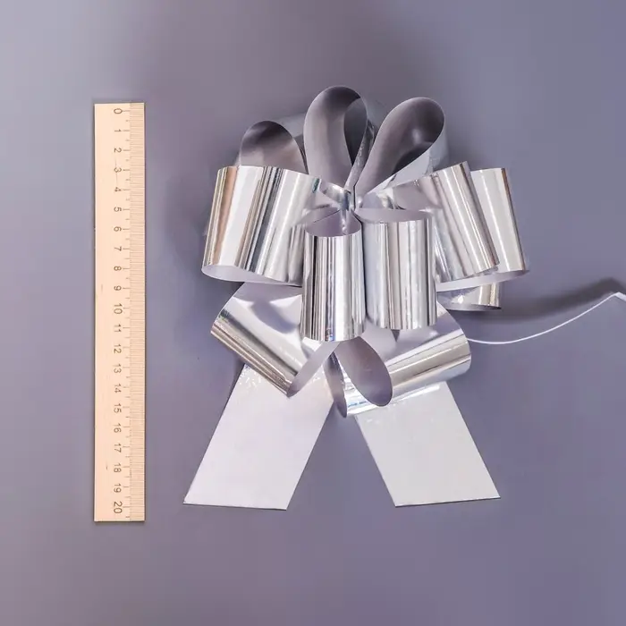 - Прочный материал, сохраняющий форму и блеск: Пластиковая лента с серебристым покрытием устойчива к деформации и выцветанию. Бант долго сохраняет первоначальный вид, что позволяет использовать его для оформления нескольких праздников.