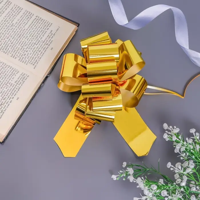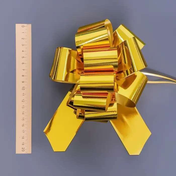 - Ширина ленты 5 см: Широкая лента создает плотный, объемный бант, который не теряется на крупных коробках. Диаметр банта пропорционален и выглядит солидно.