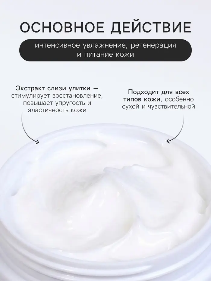Обладает интенсивным увлажняющим действием, благодаря наличию в составе активного компонента - фильтрат муцина улитки. Его уникальная способность удерживать большой объем воды в клетках позволяет быстро восстановить естественное состояние кожи (тонус, эластичность). Комплексное воздействие других активных компонентов крема дополняет и усиливает полезные эффекты, способствуя улучшению рельефа и естественной «подтяжке» кожи, разглаживанию мелких морщин и их профилактике.