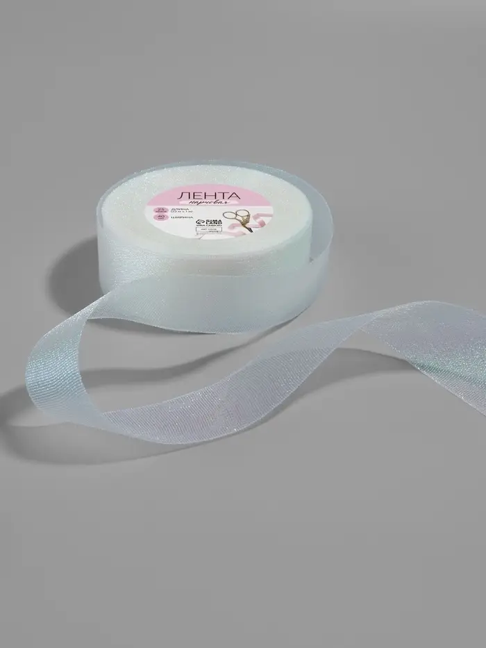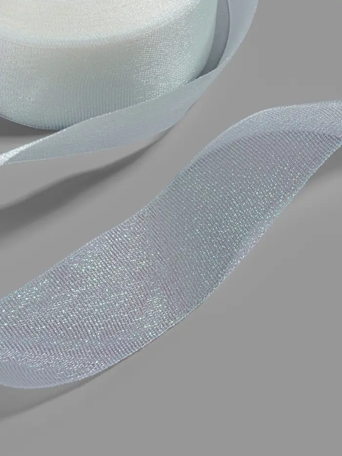Голографическая парчовая лента шириной 40 мм создает эффект мерцающего снега в новогоднем декоре. Переливающаяся поверхность меняет оттенки в зависимости от освещения.