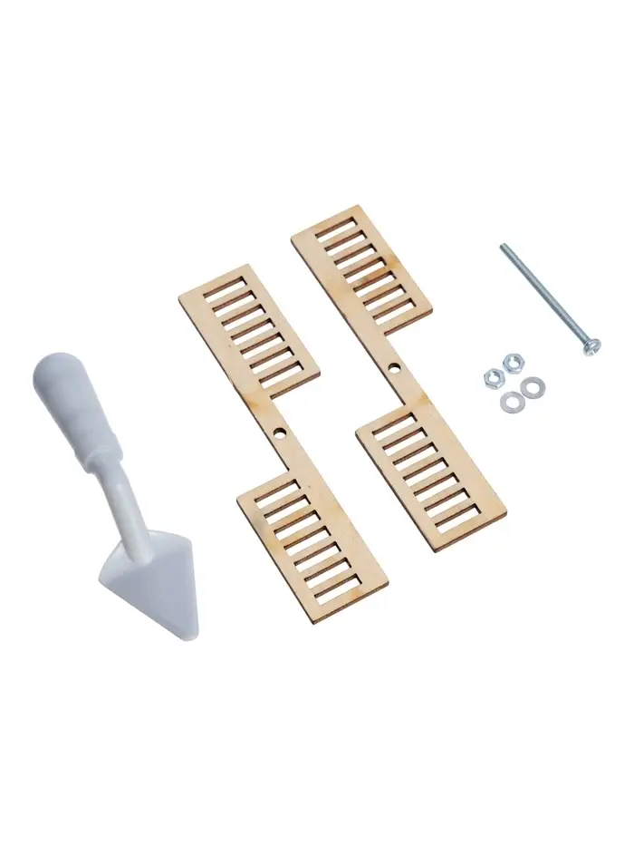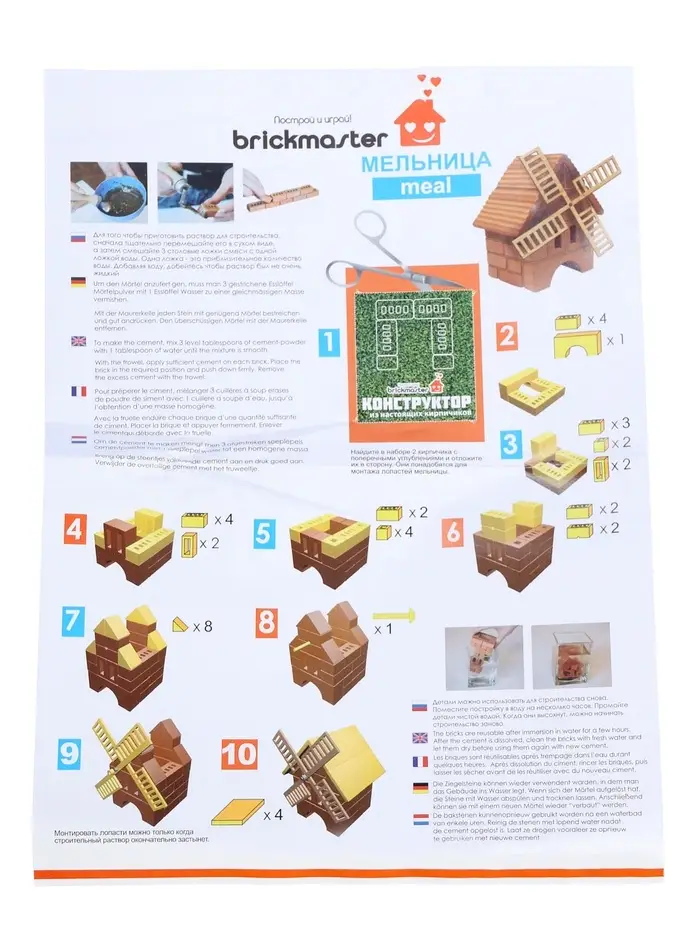 - 40 деталей для творчества: в наборе — керамические элементы, чашка для замешивания «глины», мастерок и инструкция. Готовая мельница получается размером 8×15 см — ее можно поставить на полку или украсить детскую комнату.