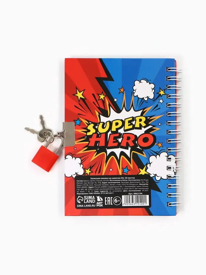 Записная книжка на замочке А6, 50 л. «Настоящий герой»