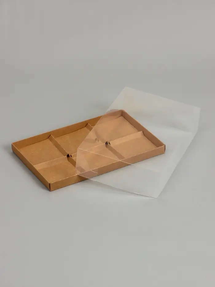 - Надёжная защита при транспортировке: Жёсткий крафтовый картон и закрытая конструкция надёжно защищают хрупкие десерты от смещения и повреждений, что особенно важно для крупных наборов.