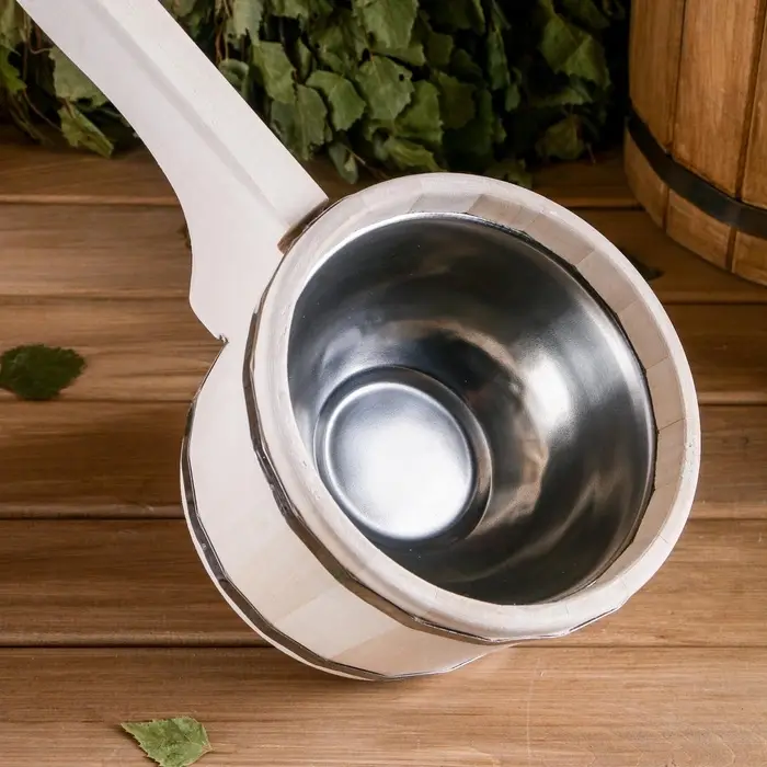 - Оптимальный объем: Ковш вмещает 900 мл, что позволяет комфортно использовать его для различных процедур, например, поливания камней или обливания водой.
