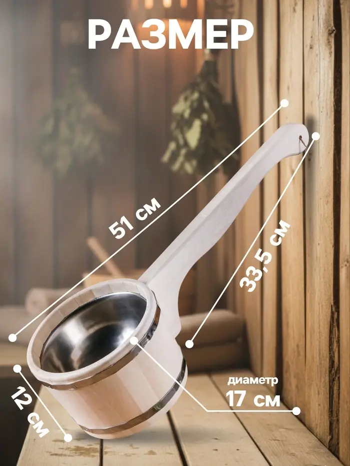 - Эргономичный дизайн: Горизонтальная ручка обеспечивает удобство захвата и маневренность в использовании. Длина ковша 51 см, идеально подходит для удобного доступа в любое место парной.