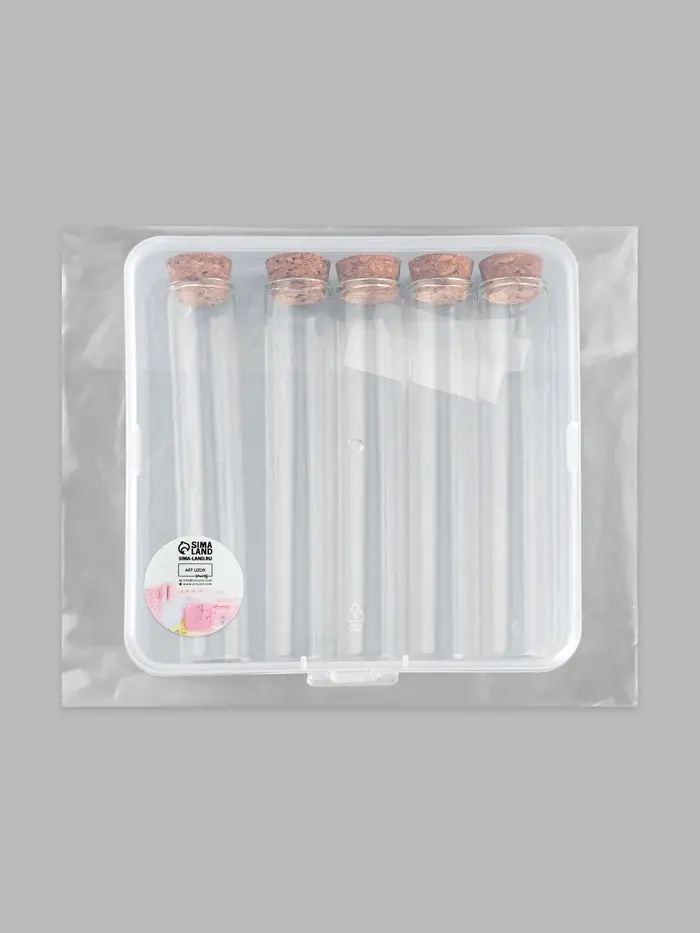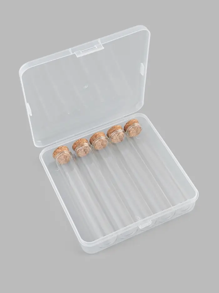 Каждая баночка имеет высоту 12 см и диаметр 2,2 см, что делает их достаточно вместительными для различных материалов, не занимая при этом много места. Прозрачный материал позволяет легко видеть содержимое, а сочетание стекла и пластика гарантирует прочность и долговечность изделий. Все баночки помещаются в эргономичный контейнер размером 13,5 × 13,5 × 3,5 см, который обеспечивает дополнительную защиту при хранении или переноске.