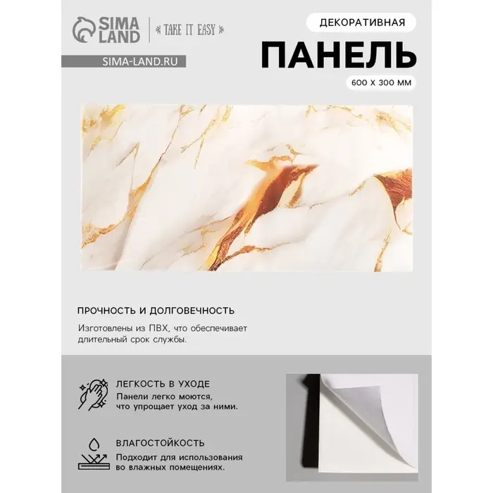Панель ПВХ самоклеящаяся TAKE IT EASY «Мрамор», 600×300 мм, цвет белый/золотой