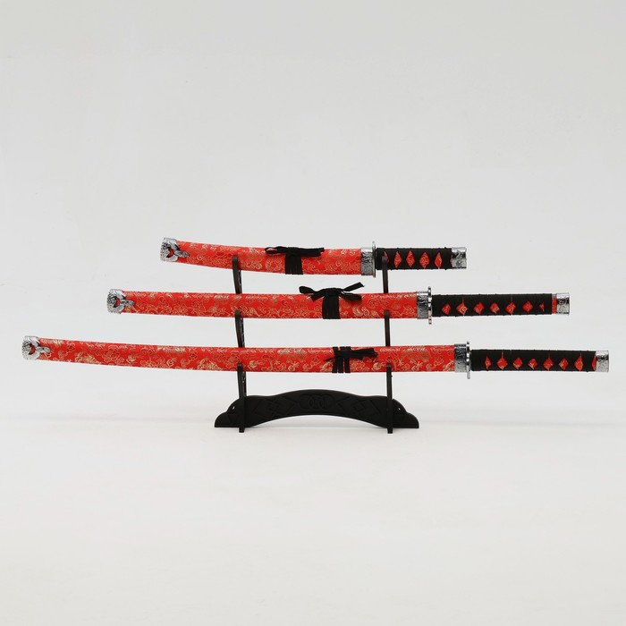 Сув. изделие катаны 3в1 на подставке, ножны кожзам, цветы на красном 47/70/89см