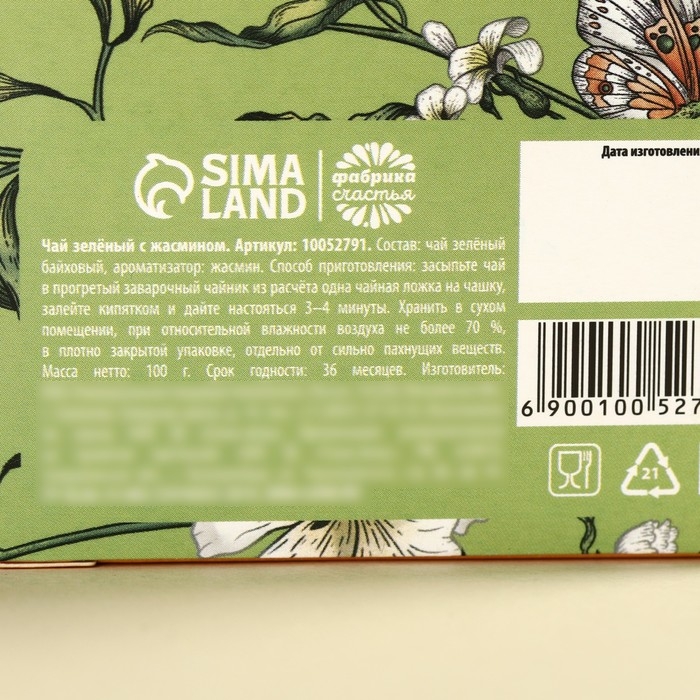 Состав: чай зелёный байховый, ароматизатор: жасмин.