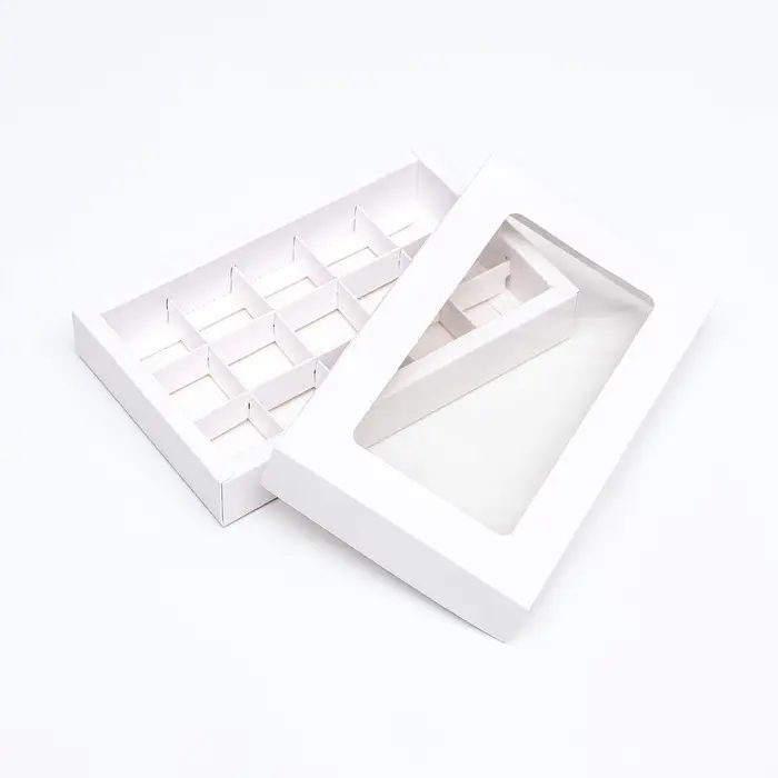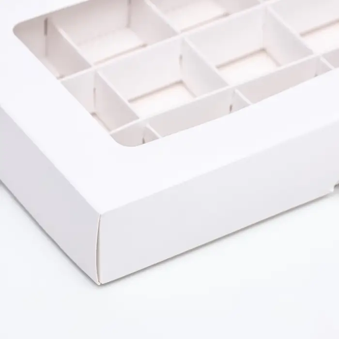 - 15 фиксированных ячеек: Внутренние перегородки надежно удерживают конфеты, шоколадные плитки или десерты. Каждый элемент занимает свое место, что сохраняет их форму и внешний вид при транспортировке.
