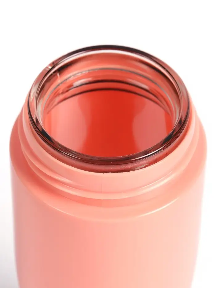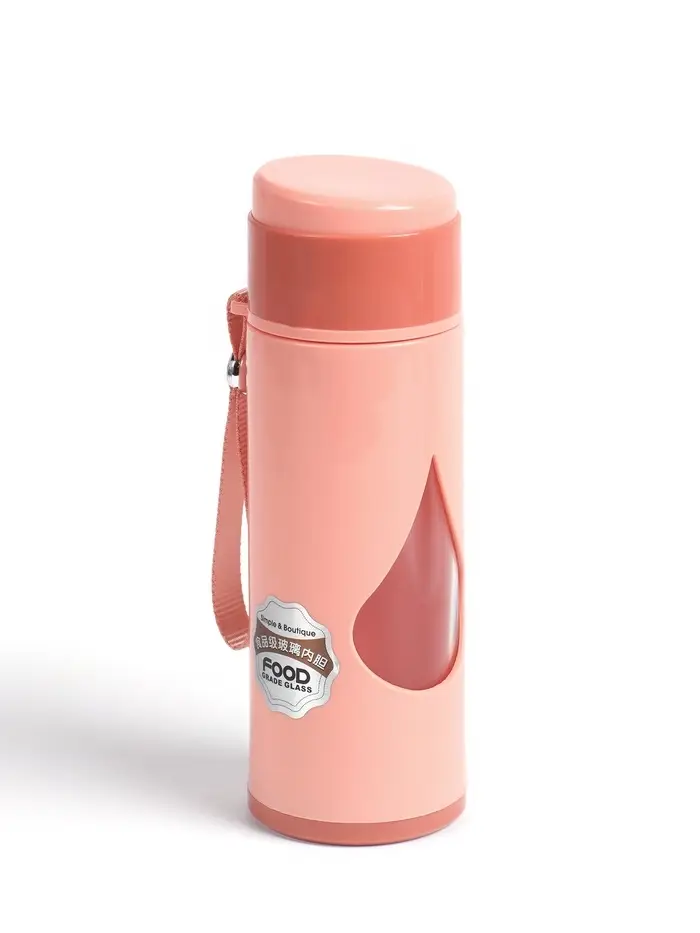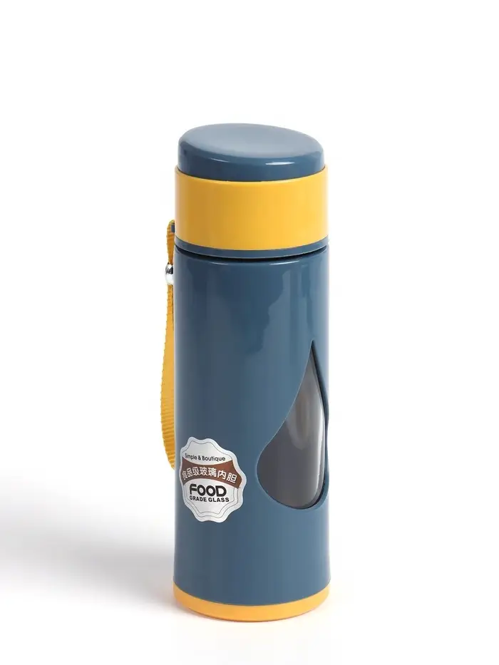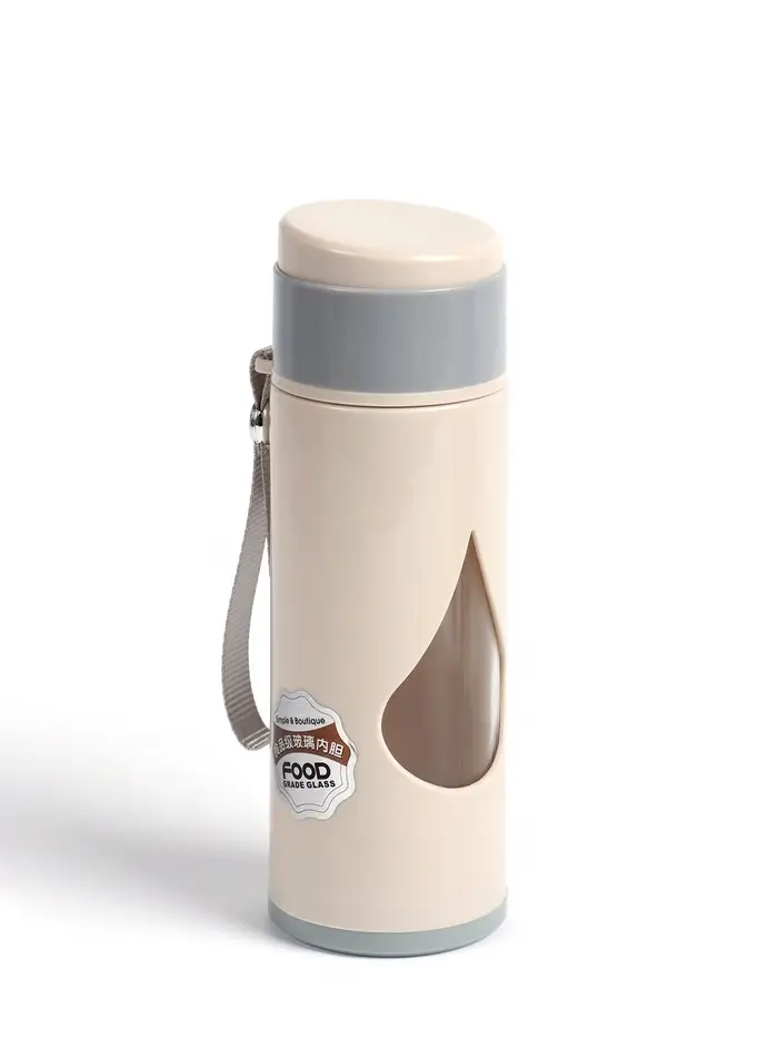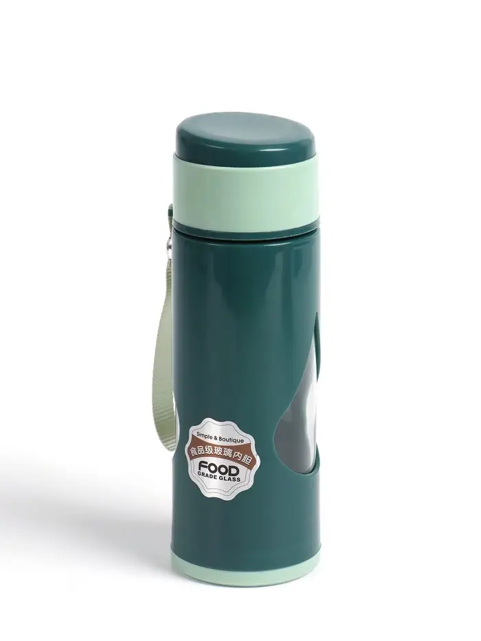 Модель имеет двойную конструкцию: внешний корпус выполнен из прочного пластика, который защищает бутылку от повреждений и делает её лёгкой, а внутренняя колба изготовлена из стекла, не впитывающего запахи и не влияющего на вкус напитков.